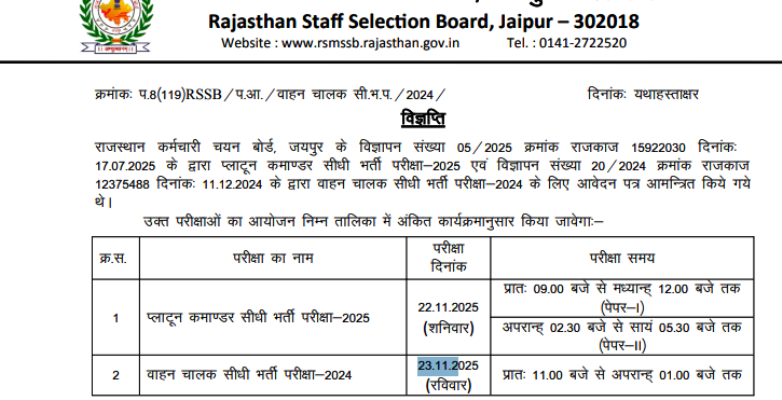 Rajasthan Subordinate Service Selection Board (RSMSSB) ने RSRTC Driver भर्ती परीक्षा की आधिकारिक घोषणा कर दी है। 2756 वाहन चालक (Driver) पदों के लिए लिखित 22-23 नवंबर 2025 को आयोजित की जाएगी । एडमिट कार्ड 3-4 दिन पहले ऑफिसियल वेबसाइट rssb.rajasthan.gov.in से डाउनलोड करें।