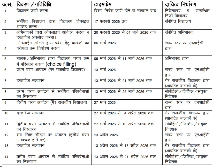 राज्य सरकार की ओर से आरटीई के तहत एडमिशन प्रक्रिया कुल 3 चरणों में पूर्ण की जाएगी। पहले चरण की एडमिशन प्रक्रिया संपन्न होने के बाद दूसरे चरण की प्रक्रिया 27 मार्च से 10 अप्रैल 2026 तक एवं अंत में रिक्त सीटों के लिए एडमिशन प्रक्रिया 13 अप्रैल से 21 अप्रैल 2026 तक पूरी की जाएगी।