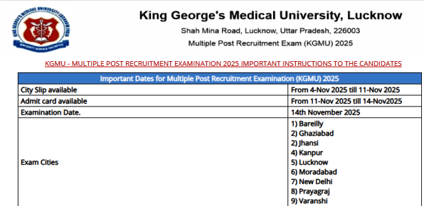 किंग जॉर्ज मेडिकल यूनिवर्सिटी KGMU लखनऊ से बड़ी खबर सामने आई है ! नर्सिंग ऑफिसर भर्ती परीक्षा 2025 के लिए Exam City Slip जारी कर दी गई हैं। और Admit Card 11 नवम्बर को जारी किये जायेंगे | अगर आपने नर्सिंग ऑफिसर भर्ती के लिए यह फॉर्म भरा है, तो अब आप इस आर्जाटिकल में जान सकते हैं कि आपकी परीक्षा किस शहर में होगी और KGMU Nursing Officer Admit Card कब जारी होगा?