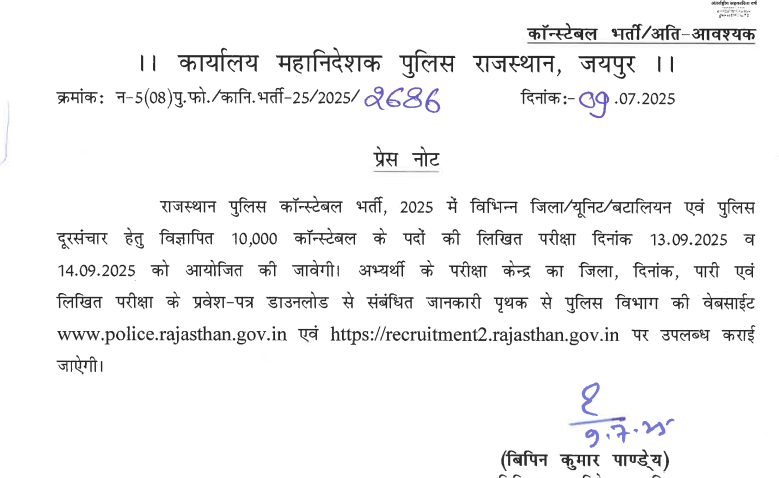Rajasthan Police Constable Admit Card 2025: राजस्थान पुलिस कांस्टेबल भर्ती 2025 की तैयारी कर रहे हैं? तो ये खबर आपके लिए बेहद अहम है! राजस्थान पुलिस कांस्टेबल एग्जाम 13 और 14 सितम्बर 2025 को अलग – अलग परीक्षा केन्द्रों में ऑनलाइन आयोजित होगी | अंतिम तिथि 25 मई 2025 तक आवेदन करने वाले सभी उम्मीदवार राजस्थान पुलिस कांस्टेबल एडमिट कार्ड 2025 का बेसब्री से इन्तजार कर रहे हैं | उम्मीद हैं कि विभाग द्वारा राजस्थान पुलिस कांस्टेबल के एडमिट कार्ड सितम्बर के दुसरे सप्ताह में अपलोड किये जा सकते हैं | उम्मीदवार ऑफिसियल वेबसाइट police.rajasthan.gov.in पर या recruitment2.rajasthan.gov.in पर जाकर एप्लीकेशन आईडी और पासवर्ड लॉग इन कर Rajasthan Police Constable Admit Card 2025 डाउनलोड कर सकेंगे |