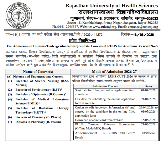 Rajasthan University of Health Sciences conducted the entrance examination for students to be admitted to the university. RUHS Bsc Nursing Entrance Exam Conduct from 21 May 2026 for admission in various courses such as BSc Nursing, BPT, BRT, B.Pharm, and post-basic nursing courses by the university. The university will release the admit card for the applicants on the official website. RUHS Bsc Nursing Entrance Exam 2026 will be conducted in offline mode at various examination centers.